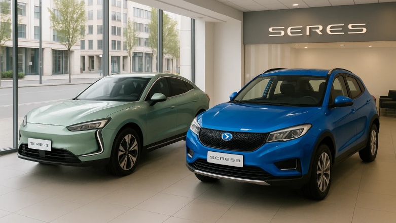 SUV eléctricas Seres 5 y Seres 3 en la vitrina de un concesionario.