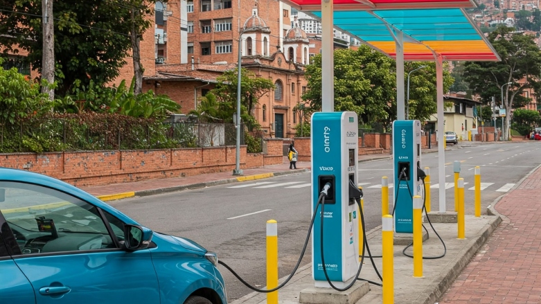 Electrolinera en calles de la ciudad de Bogotá, Colombia con un vehículo cargando.