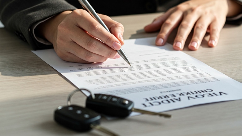 Persona firmando un contrato de financiamiento vehicular.