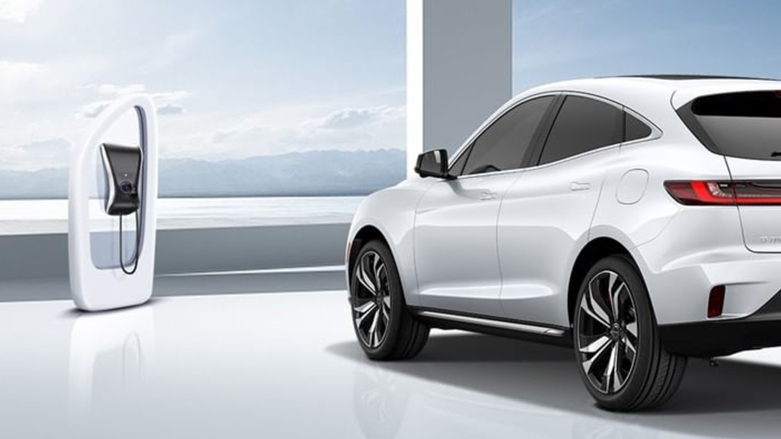 Vista trasera de auto eléctrico Seres 5 color blanco con una estación de carga a su lado.